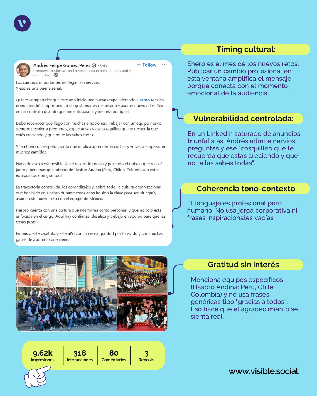 En un LinkedIn saturado de anuncios triunfalistas, Andrés admite nervios, preguntas y ese “cosquilleo que te recuerda que estás creciendo y que no te las sabes todas”. No es falsa humildad: es honestidad profesional. Eso genera confianza inmediata y rompe el patrón de “todo está perfecto”. La gente responde porque se ve reflejada.