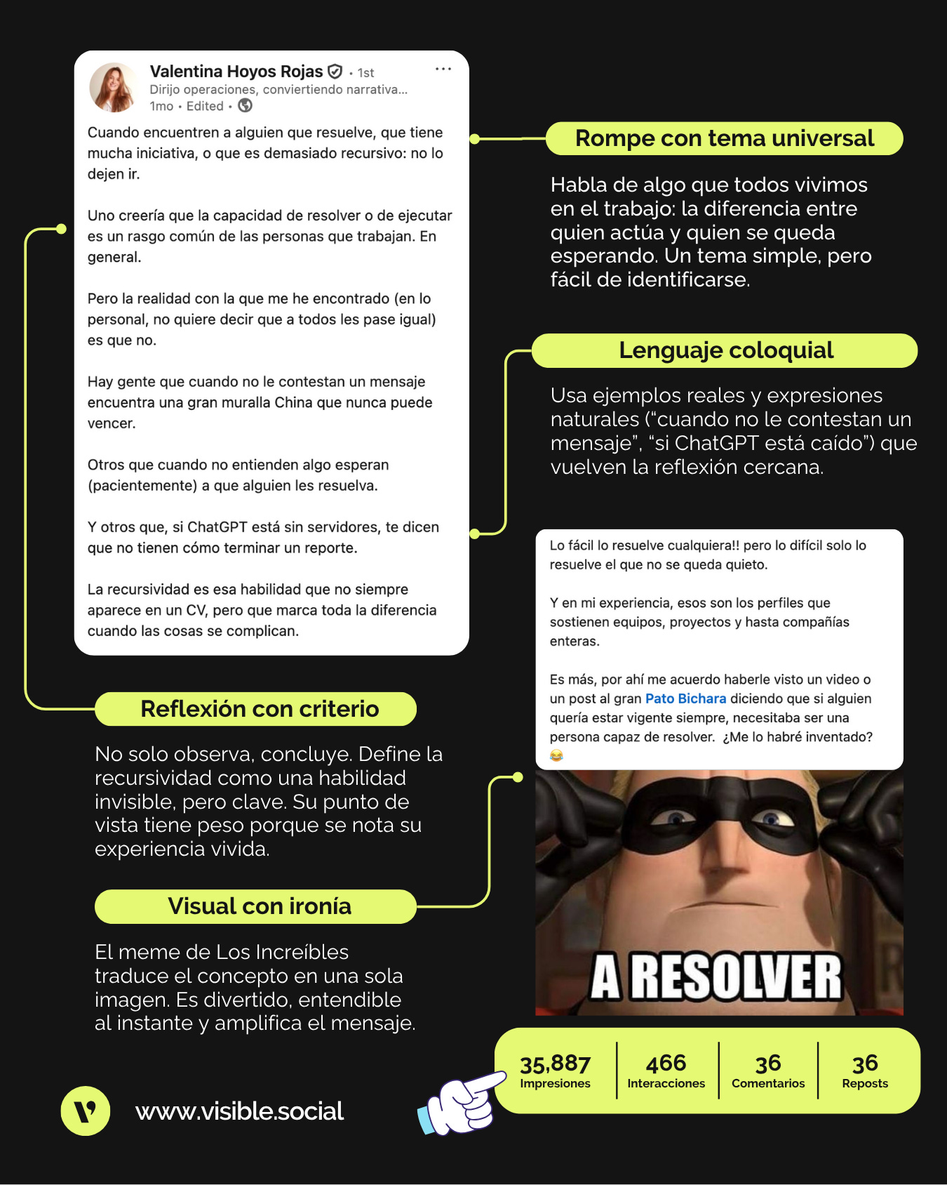 Tema universal que engancha: Habla de algo que todos hemos visto o vivido en el trabajo: la diferencia entre quienes resuelven y quienes se quedan esperando. Un punto de partida simple, pero con el que cualquiera se identifica.