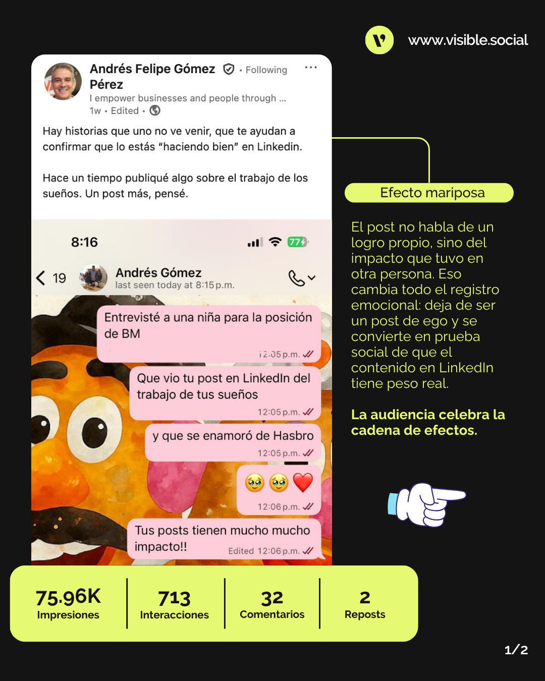 Efecto mariposa: El post no habla de un logro propio, sino del impacto que tuvo en otra persona. Eso cambia todo el registro emocional: deja de ser un post de ego y se convierte en prueba social de que el contenido en LinkedIn tiene peso real. La audiencia no celebra al autor, celebra la cadena de efectos.