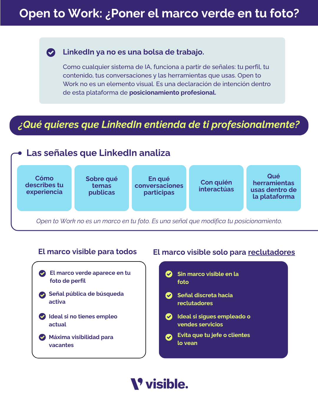 Porque entonces entendemos que esta herramienta no es solo un marco verde en tu foto de perfil. Open to Work es una señal que tú estás activando dentro del sistema de la plataforma. Y LinkedIn, como cualquier sistema basado en inteligencia artificial, funciona a partir de señales.