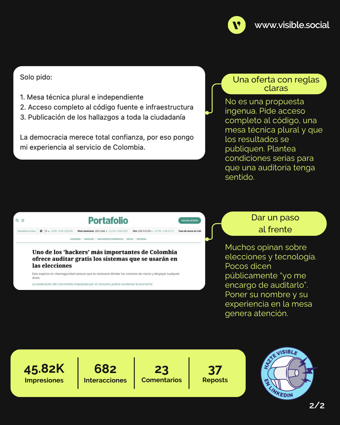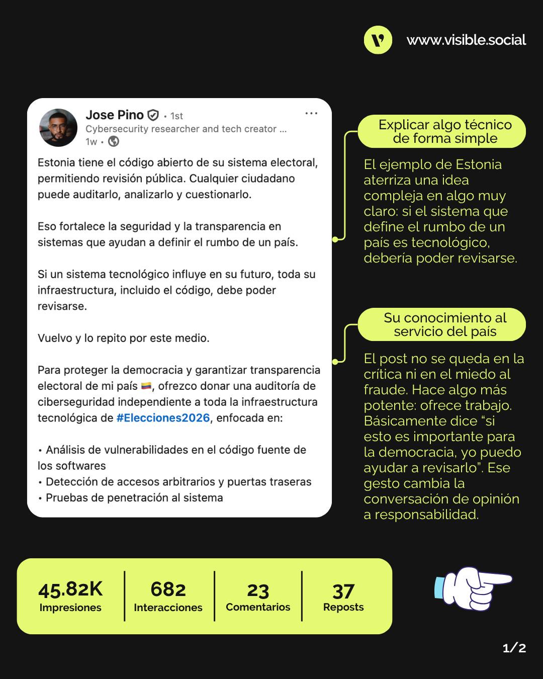 Muchos posts sobre elecciones se quedan en la preocupación o la crítica. Este va un paso más allá: el autor ofrece donar una auditoría de ciberseguridad. Pasar de opinión a acción cambia el tono del post y lo vuelve mucho más potente.Exposición pública del autor