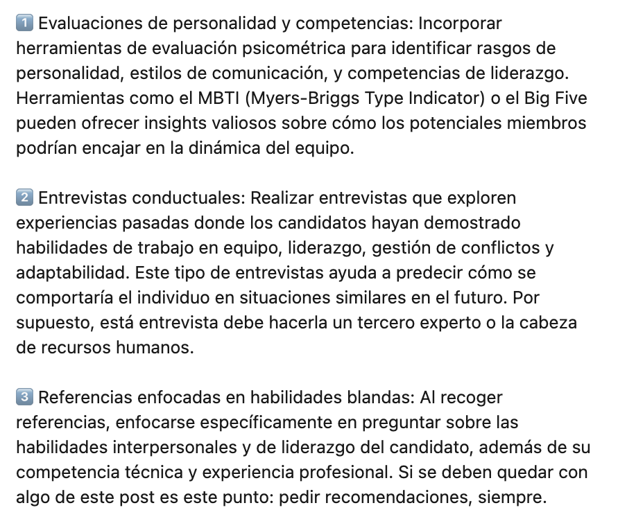 Interes: El post continúa generando interés al proponer la consideración de las habilidades blandas en el proceso de selección, ofreciendo tres opciones de acciones que enriquecen este proceso. Al plantear una aproximación que incluye la personalidad en la selección de miembros, el texto apela a la curiosidad del lector sobre cómo estos elementos pueden integrarse en prácticas empresariales.