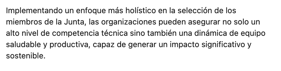 Deseo: El texto sugiere que una elección idónea y holística de miembros de la junta, que integre habilidades blandas, tiene un impacto significativo en la sostenibilidad empresarial. Este argumento está diseñado para crear en el lector el deseo de aplicar estos principios en sus propias organizaciones pues plantea que al lograr una buena elección de un miembro de junta, se lográ un mayor impacto en términos de sostenibilidad empresarial.