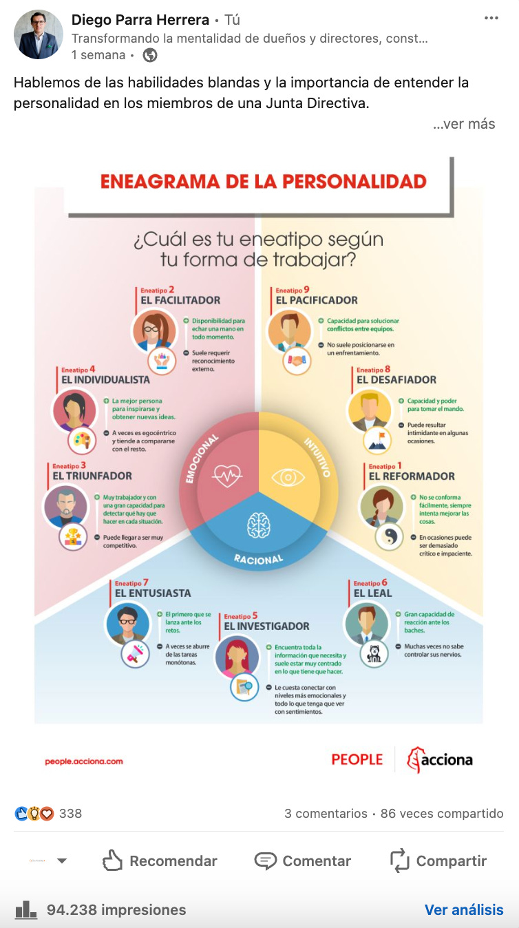 Acción: Finalmente, incita a la acción invitando a los lectores a explorar la imagen compartida que desarrolla los diferentes tipos de personalidades mediante una metodología específica, el eneagrama.