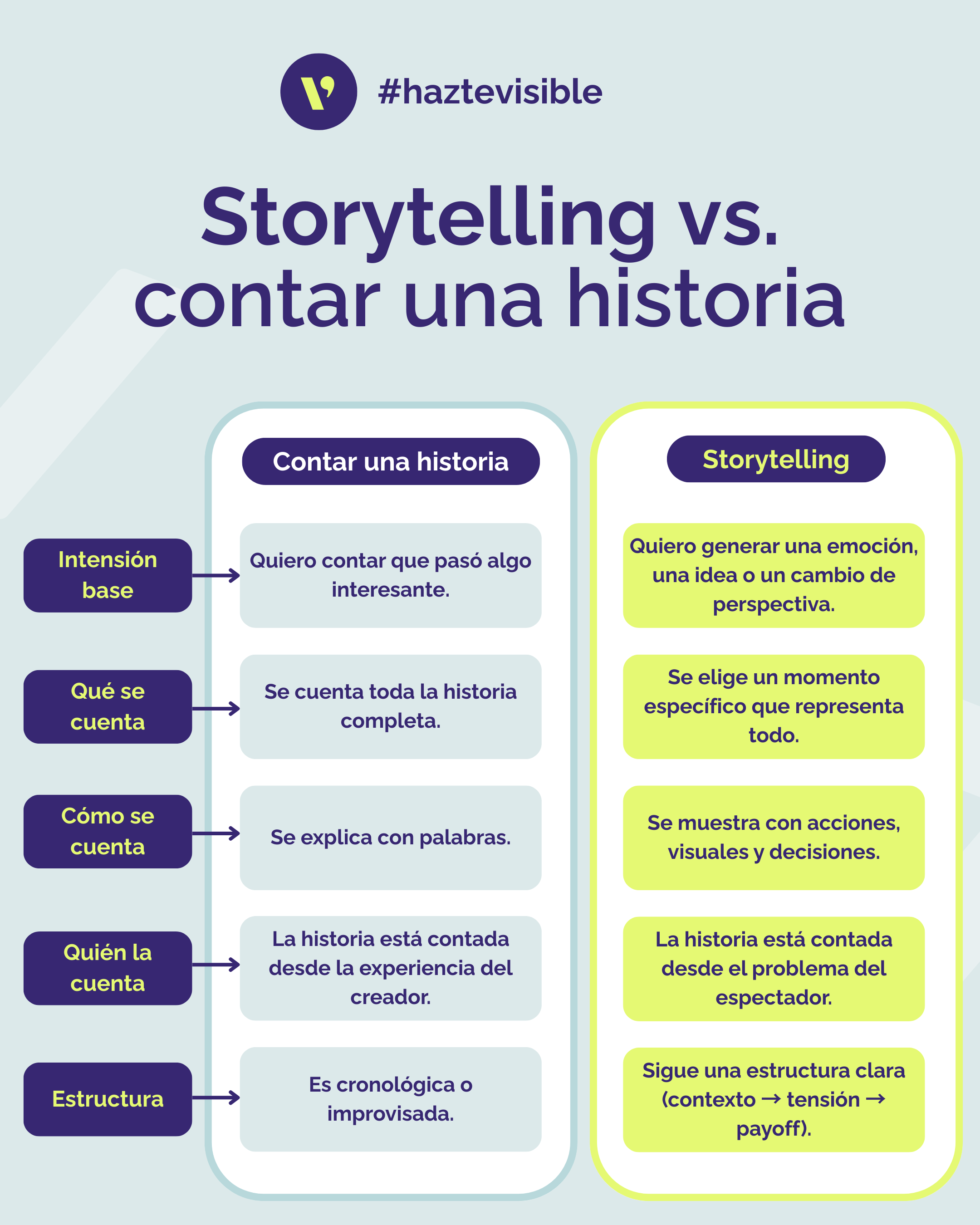 En “contar una historia”, la intención suele ser: “quiero contar que pasó algo interesante”. En storytelling, la intención es: “quiero generar una emoción, una idea o un cambio de perspectiva”.