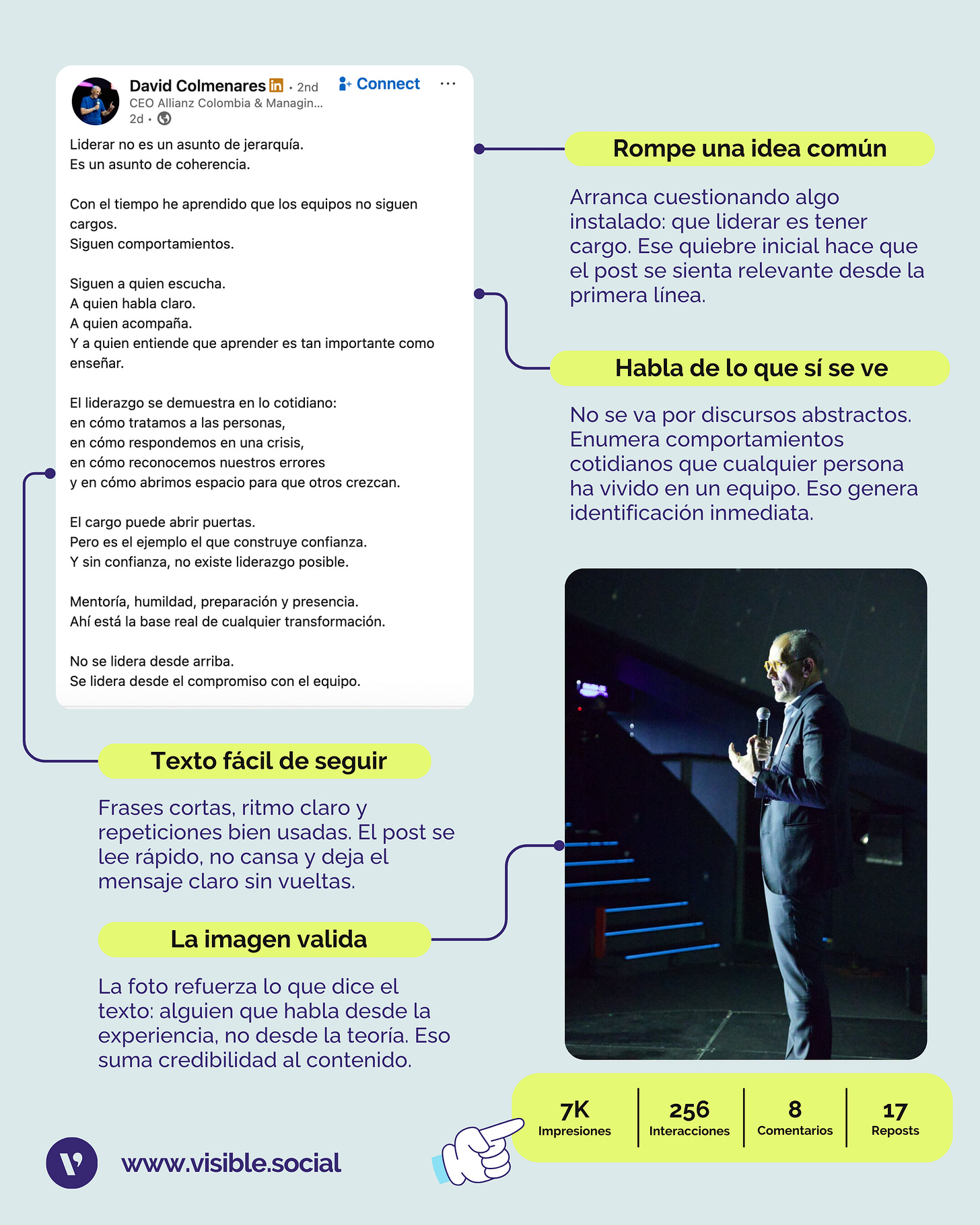 Rompe una idea común: Arranca cuestionando algo muy instalado: que liderar es tener cargo. Ese quiebre inicial hace que el post se sienta relevante desde la primera línea.
